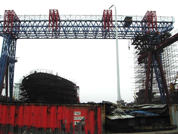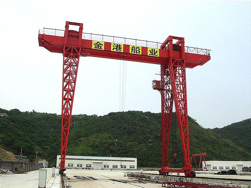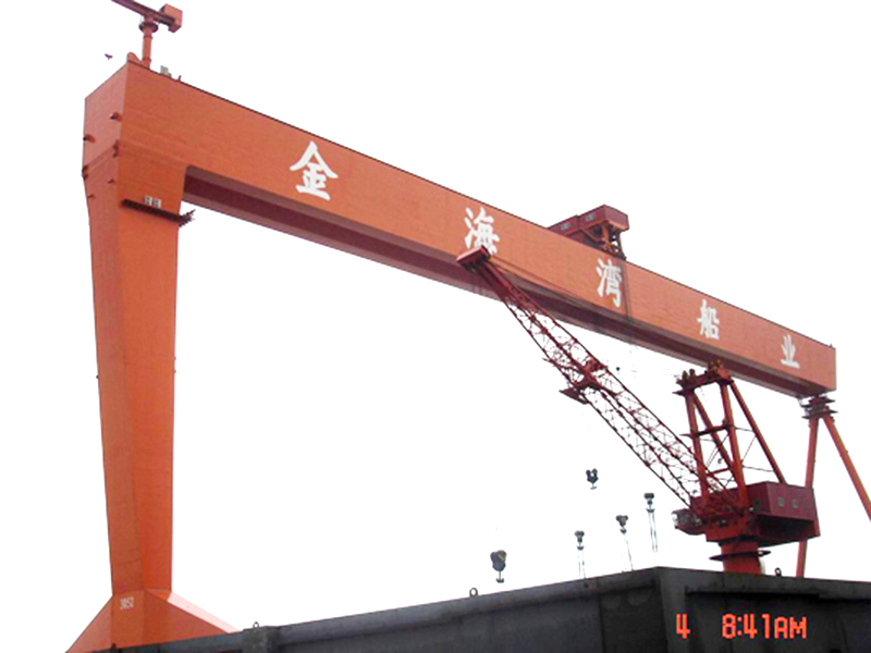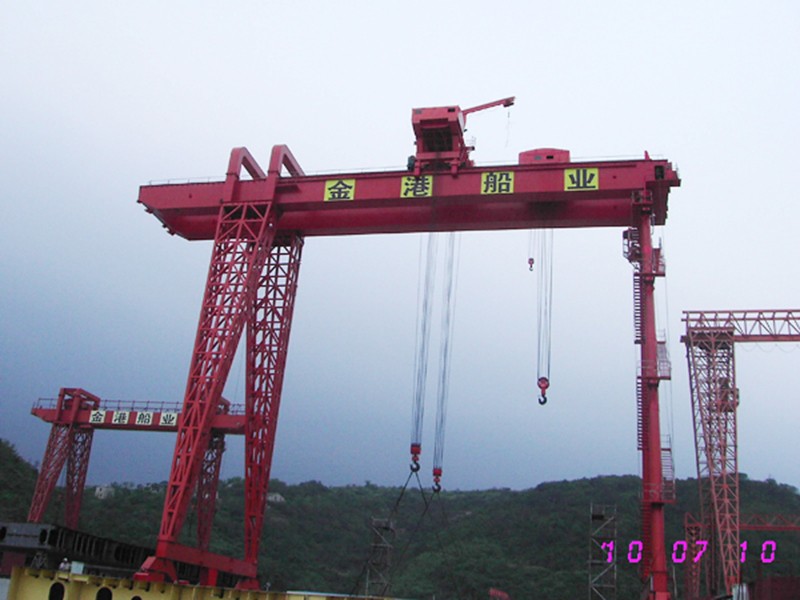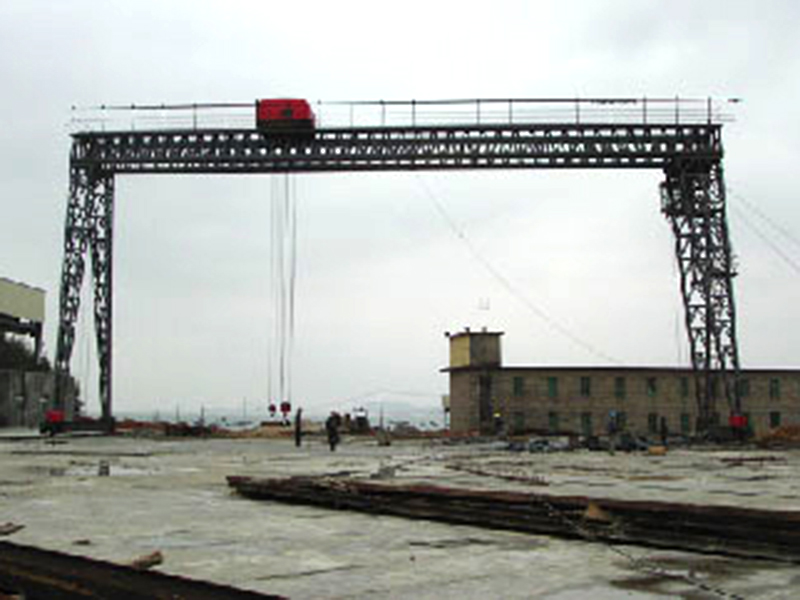 造船門式起重機適用于造船廠制作場所(船塢、船臺)進行造船作業(yè),具有單吊、雙點抬吊、三點抬吊、空中翻轉吊件和輕載(≤50%滿載)快速升降、低風速(≤8m/s)快速運行等多種作業(yè)功能,在起重機整體吊裝